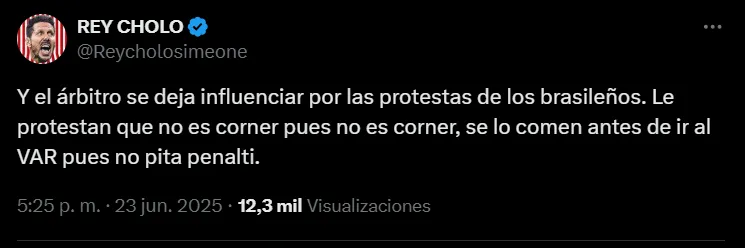 En redes sociales, los aficionados no tardaron en destrozarlo y usaron seis palabras para sentenciarlo: “Peor árbitro del Mundial de Clubes”. Además, criticaron que “el árbitro se deja influenciar por las protestas de los brasileños. Le protestan que no es córner, pues no es córner, se lo comen antes de ir al VAR, pues no pita penalti”.