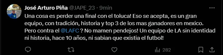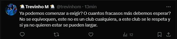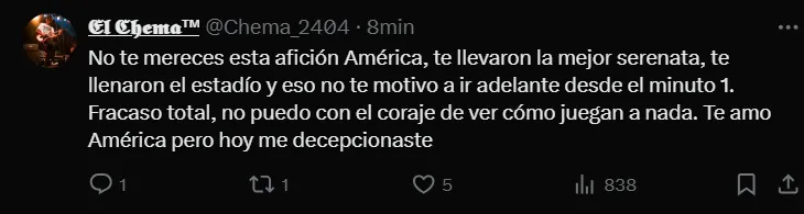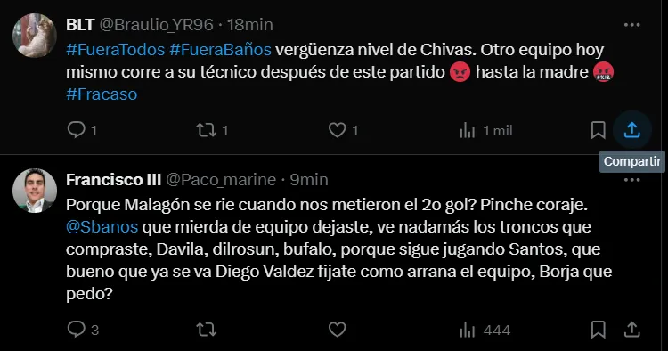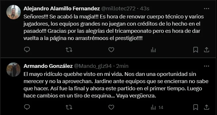 Con otro fracaso consumado, la afición del equipo no los perdonó. “8 PALABRAS P-E-N-D-E-J-O-S“, “Para eso le quitamos el lugar al León? son una vergüenza hdsptm’s“, fueron algunos de los mensajes que se vieron en las respuestas en la cuenta oficial de ‘X’, ex Twitter, del club.