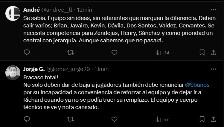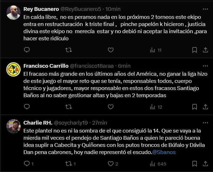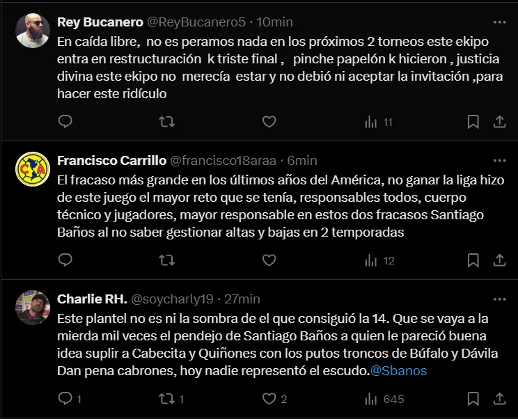 “Fracaso total! No solo deben dar de baja a jugadores también debe renunciar @Sbanos por su incapacidad a conveniencia de reforzar al equipo y de dejar ir a Richard cuando ya no se podía traer su remplazo. El equipo y cuerpo técnico se ve y nota cansado“, fue otros de los mensajes de la afición reclamando incluso a Santiago Baños, presidente de América.