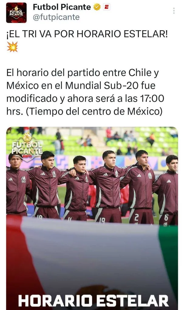 Después de que la Selección Mexicana Sub 20 consiguiera su pase a los Octavos de Final del Mundial en esta categoría se supo que su rival a enfrentar sería Chile, los anfitriones de esta Copa del Mundo. Sin embargo, en un inicio se mencionó que sería ese el horario que manejarían porque ya estaba estipulado, por lo que el encuentro se disputaría a las 13:30 horas del centro de México.