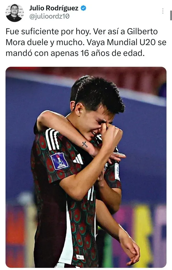 El mediocampista lloró luego de lo que fue la derrota de México ante Argentina. La desazón fue total, ya que antes del encuentro Mora había asegurado que el equipo estaba para ser campeón, y es por eso que su reacción fue tan dura tras quedar afuera del Mundial Sub-20.