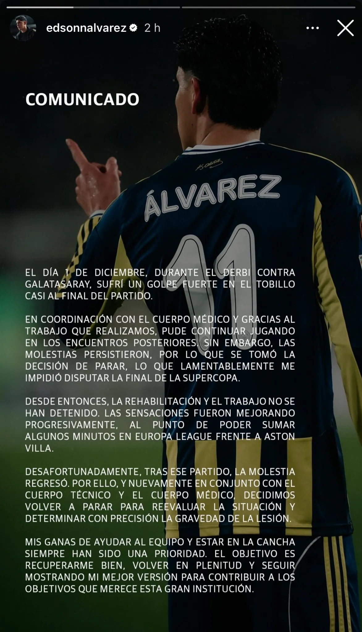 En un comunicado que compartió en sus redes sociales, el “Machín” dio a conocer que cuando se midió el 1 de diciembre ante el Galatasaray en el Clásico, sufrió ese golpe, por lo que después junto con el cuerpo médico se llevó a cabo un tratamiento para que pudiera mejora, pero lamentablemente volvió a recaer, pese a estar jugando con molestias.