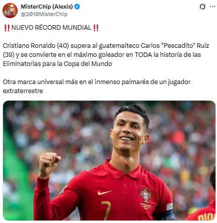 Sin embargo, aunque lo ideal para el conjunto lusitano era conseguir esa victoria y ya ser considerados como otro de los países con su lugar asegurado en la Copa del Mundo, a nivel individual Cristiano logró superar una de las marcas que había sostenido el guatemalteco Carlos Ruiz en eliminatorias mundialistas, pues su doblete de hoy le ayudó a conseguirlo.