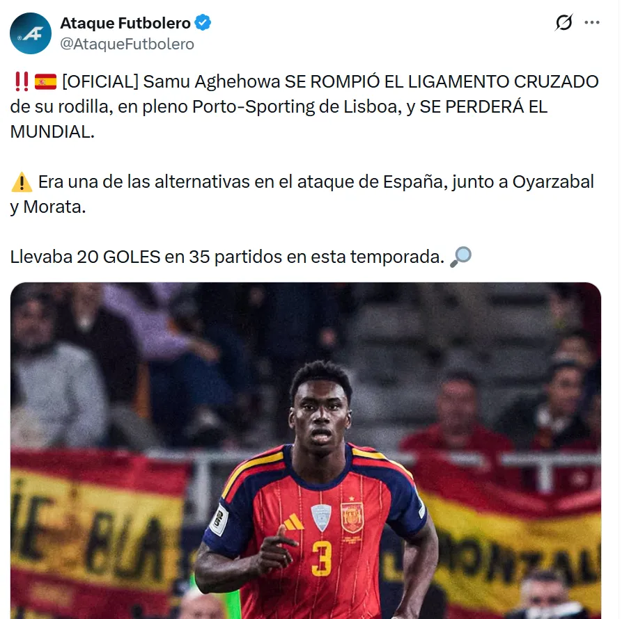 La Roja ya sufrió un golpe inesperado: Samu Aghehowa se rompió el ligamento cruzado de la rodilla durante el clásico entre Porto y Sporting de Lisboa y quedó descartado para el Mundial 2026. Su recuperación seguramente lleve más de seis meses.