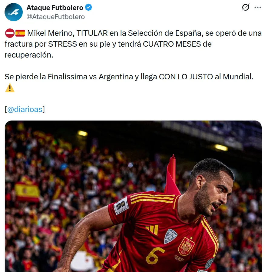 Según informó Diario AS, Mikel Merino, habitual titular en el mediocampo de la Selección de España, fue intervenido quirúrgicamente por una fractura por estrés en uno de sus pies.