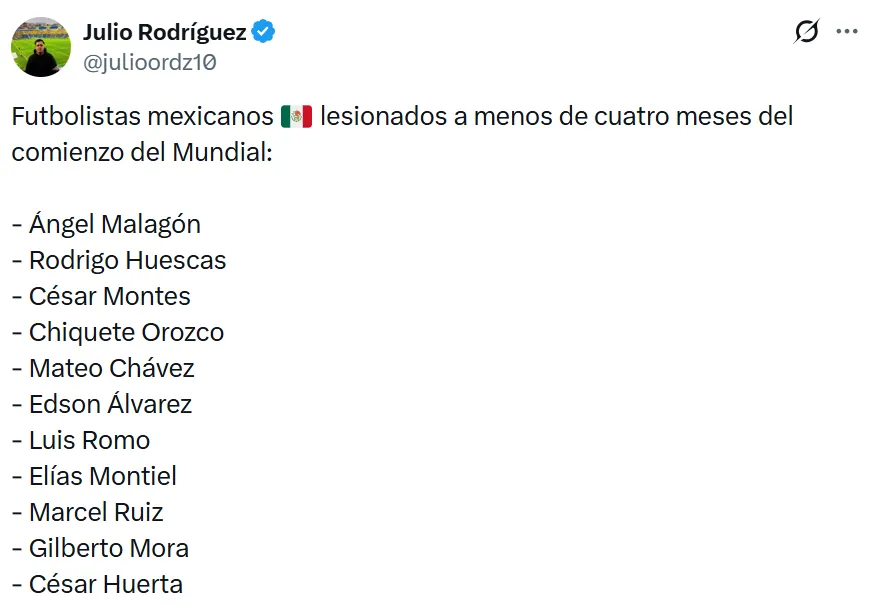La Selección de México sigue sumando preocupaciones a menos de cuatro meses para el inicio del Mundial 2026. Tras la confirmación de que Luis Ángel Malagón será baja por su ruptura del tendón de Aquiles, otra figura importante encendió las alarmas del cuerpo técnico y de los aficionados.