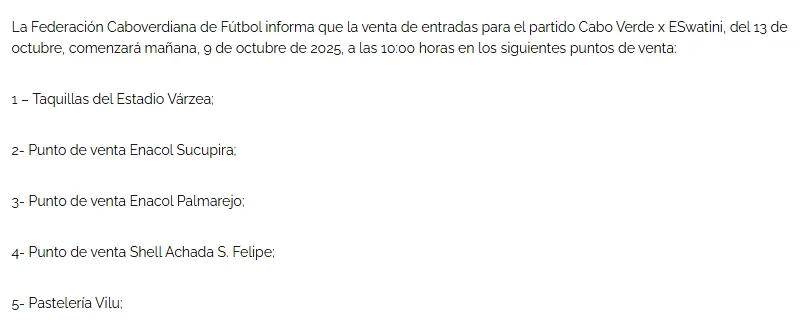 Para este duelo, el gobierno ha declarado media jornada en todo el país (525 mil personas) para que estén presentes en este hito para el futbol de Cabo Verde. Uno de los datos interesantes fue que los boletos se agotaron en tiempo récord aún cuando los puntos de venta fueron algo peculiares; un par de gasolineras (Enacol Sucupira y Palmarejo), una pastelería (Vilú) y desde luego, el mismo Estadio Várzea.