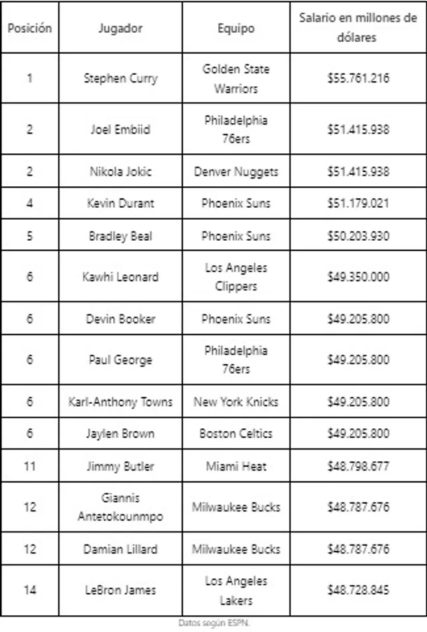 Cuando la temporada NBA 2024-25 inicie el martes 22 de octubre con los partidos New York Knicks vs. Boston Celtics (19:30 ET) y Minnesota Timberwolves vs. Los Angeles Lakers (22:00 ET), Stephen Curry ocupará el primer lugar como el jugador con mejor salario ($55.7 millones de dólares), mientras que LeBron James tendrá la última posición (US$48.7 millones) en el Top-14 protagonista de esta historia.