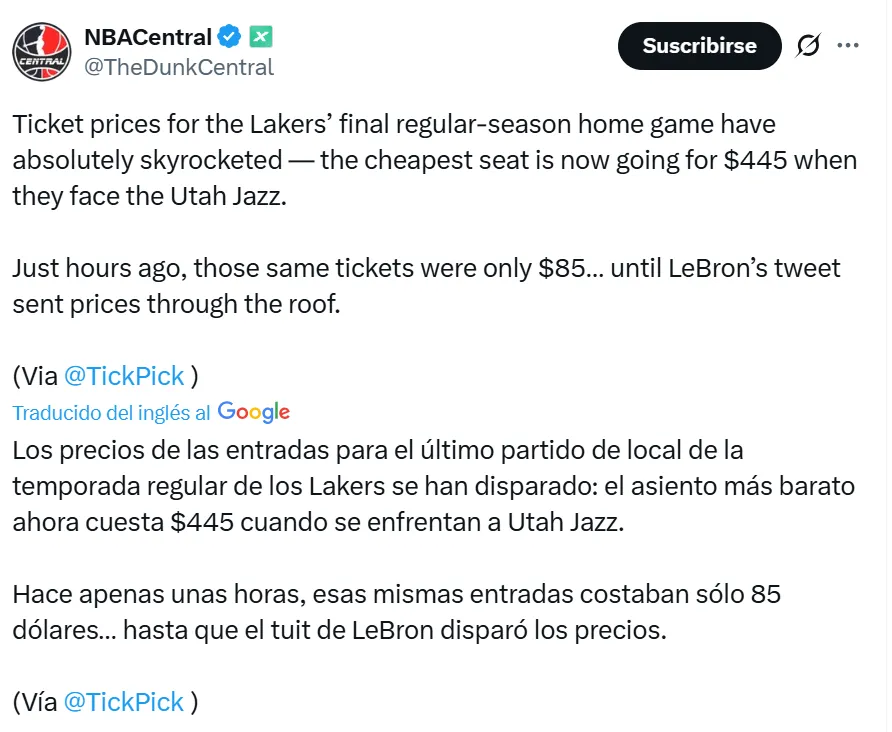 Según la información de Tick Pick, los boletos para el último juego de local de los Lakers en la temporada regular se fueron por las nubes. El ticket más económico para el duelo ante Utah Jazz ya alcanza los 445 dólares. Hace tan solo unas horas, esos mismos asientos se ofrecían por 85 dólares, pero todo cambió después del mensaje publicado por LeBron James, que provocó una verdadera locura entre los fanáticos.