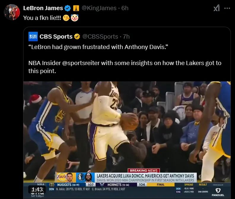 Puntualmente, la figura de los Lakers fue apuntada como uno de los causantes de la salida de AD del equipo por el medio estadounidense CBS Sports. “LeBron se había frustrado con Anthony Davis”, aseguraba el mencionado canal. Fue entonces que el ‘King’ se pronunció en su cuenta de X y respondió: “You a fkn lie!!!” (una maldita mentira), acompañado de un emoji de nariz grande y otro de payaso.