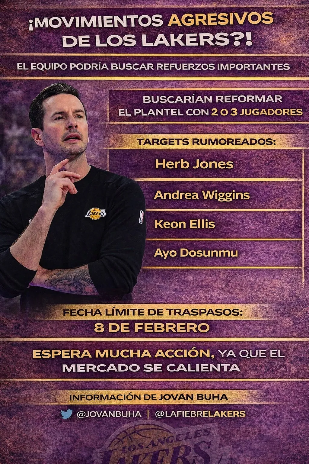 - Jovan Buha reveló que Los Ángeles Lakers buscan sumar dos o tres refuerzos nuevos.