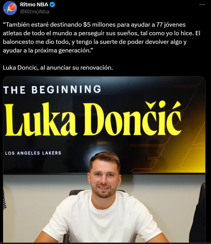 “También estaré destinando $5 millones para ayudar a 77 jóvenes atletas de todo el mundo a perseguir sus sueños, tal como yo lo hice. El baloncesto me dio todo, y tengo la suerte de poder devolver algo y ayudar a la próxima generación”, comentó Doncic.