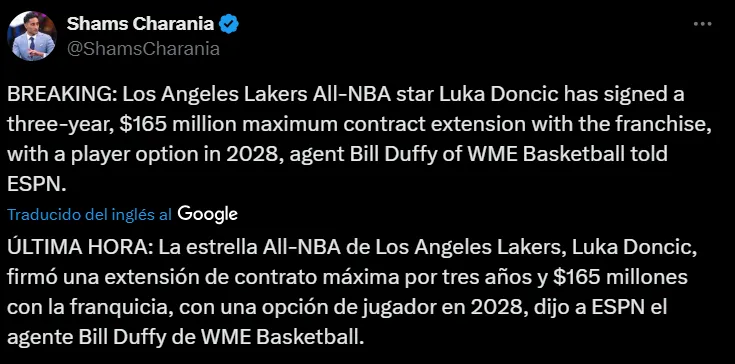 El periodista Shams Charania confirmó en su cuenta de X que Doncic tendrá un contrato importante de 165 millones, es decir, que se asegurará un total de 55 millones de dólares por cada año en el que esté en el equipo, siendo así uno de los mejores pagos.