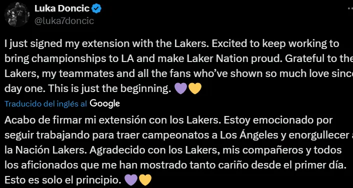 El mensaje de Luka Doncic tras renovar contrato no tardó en llegar y dejó en claro su compromiso con la franquicia: “Acabo de firmar mi extensión con los Lakers. Estoy emocionado por seguir trabajando para traer campeonatos a Los Ángeles y enorgullecer a la Nación Lakers. Agradecido con los Lakers, mis compañeros y todos los aficionados que me han mostrado tanto cariño desde el primer día. Esto es solo el principio”.