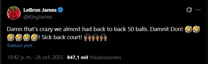 Luego de que se confirmara la gravedad de la lesión de Luka Doncic, Los Angeles Lakers vencieron a Sacramento Kings por 127 a 120 con 51 puntos de Austin Reaves. Esto fue el disparador para que LeBron le reclamara a Doncic publicando en X el siguiente mensaje: “¡Qué locura! Casi tuvimos (juegos de) 50 pelotas consecutivas. ¡Maldita sea, Don! ¡Qué mala cancha!“.