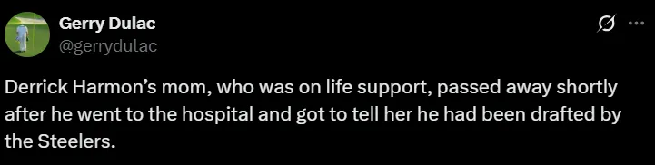 De acuerdo al periodista Gerry Dulac, de Pittsburgh Post- Gazzete, la madre de Harmon, Tiffany Saine, quien se encontraba con soporte vital tras un derrame cerebral sufrido en 2022, falleció justo después de que el jugador la visitara en el hospital para comunicarle la noticia de su selección por Pittsburgh. “La madre de Derrick Harmon, quien estaba con soporte vital, murió poco después de que él fuera al hospital y le comunicara que fue seleccionada en el Draft por Pittsburgh Steelers”, escribió Dulac en su cuenta personal de X (ex Twitter).