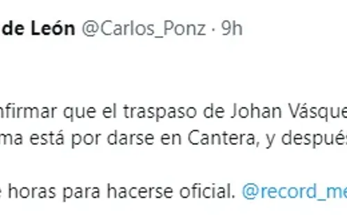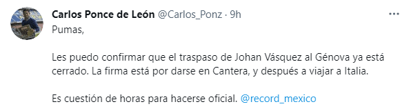 “Pumas, les puedo confirmar que el traspaso de Johan Vásquez al Génova ya está cerrado. La firma está por darse en Cantera, y después a viajar a Italia. Es cuestión de horas para hacerse oficial”, publicó el director de dicho medio, Carlos Ponce, a través de su cuenta de Twitter.