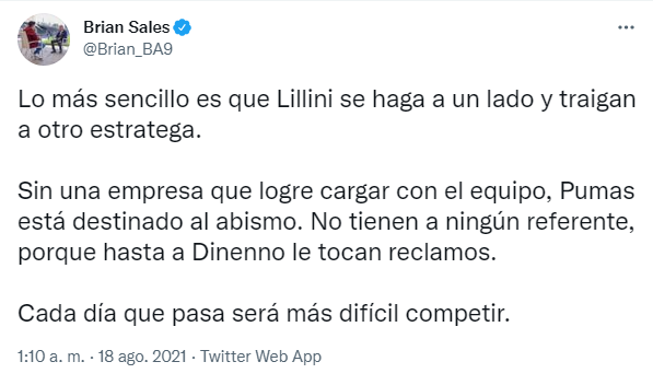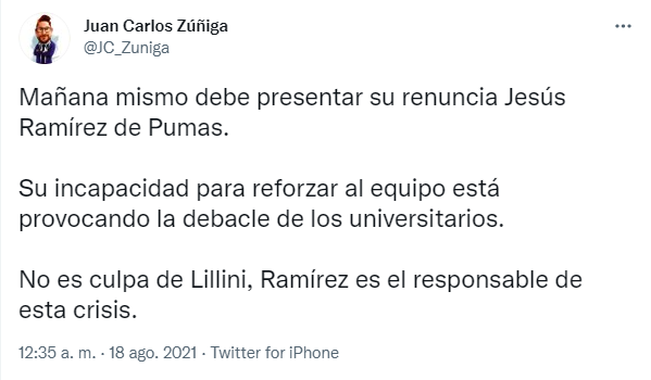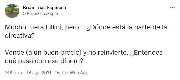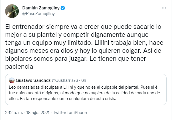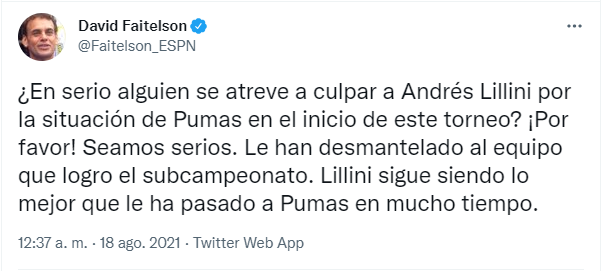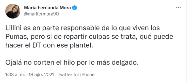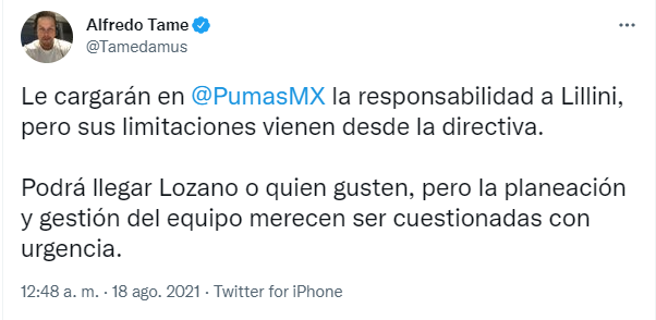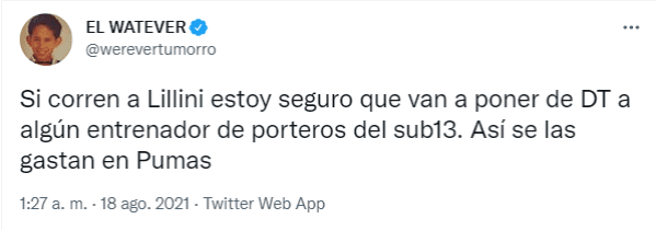 Luego de la patética actuación en la caída frente a Necaxa por 3 a 0,la afición denostó a los futbolistas y a la directiva, pero en la mayoría de los casos hubo algo de piedad contra Andrés Lillini. Si bien su nombre fue tendencia en Twitter, muchos lo corrieron de la máxima responsabilidad por el desmantelamiento que sufrió luego del subcampeonato en el Guard1anes 2020.