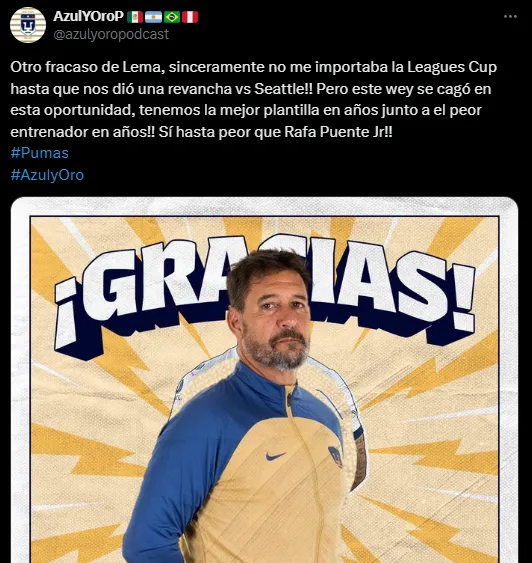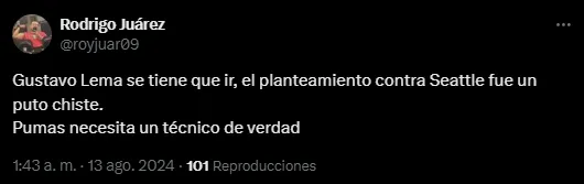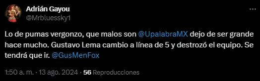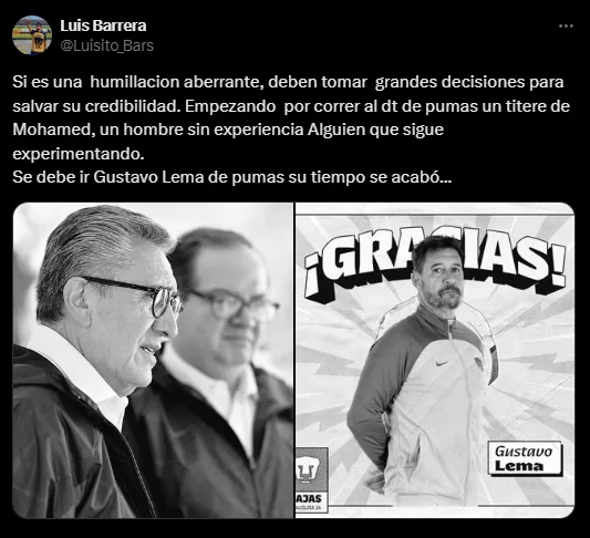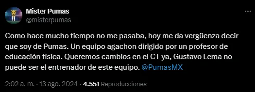Los comentarios de los usuarios simpatizantes de los Felinos fueron muy duros, pero producto de lo que sintieron por tal resultado. “Me dio vergüenza ser de Pumas, Lema no puede seguir“, “Traigamos un técnico de verdad y no un auxiliar de otro que nos traicionó” y “Gustavo Lema es un títere de Mohamed, un hombre sin experiencia que sigue experimentando”, fueron algunos de los posteos más fuertes contra el argentino.