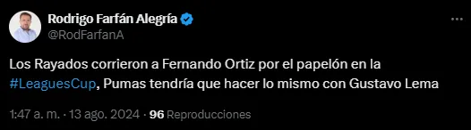 Los aficionados de Pumas UNAM tomaron el ejemplo de Rayados y adujeron que si otro club importante como Monterrey tomó la decisión de destituir a su entrenador Fernando Ortiz, la directiva auriazul también debiera hacer lo mismo con Gustavo Lema y poner fin a su paso por Ciudad Universitaria.