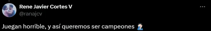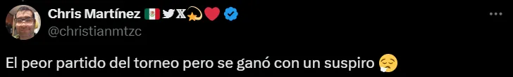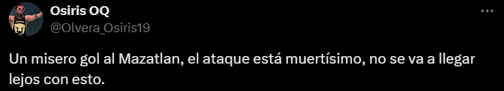 “El peor partido del torneo, pero se ganó con un suspiro”, “un mísero gol a Mazatlán, el ataque está muertísimo, no se va a llegar lejos con esto”, “mi equipo de maletas le ganó por la mínima diferencia al equipo lugar 13… Toda una hazaña” y “juegan horrible, y así queremos ser campeones”, fueron algunos de los comentarios de los fanáticos en X (ex Twitter).
