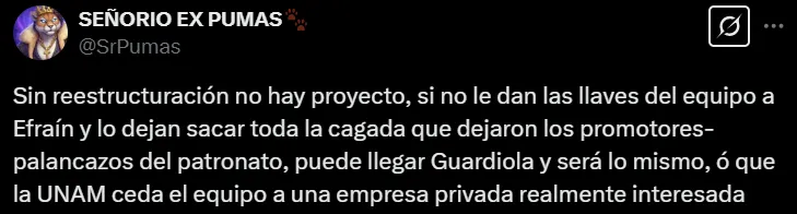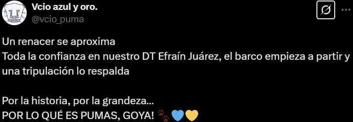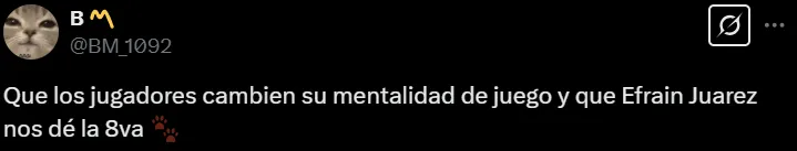 “Toda la confianza en nuestro DT Efraín Juárez”, “bienvenido de vuelta a casa”, “se viene la octava” y “una vez más estoy ilusionado”, fueron los mensajes de los simpatizantes más optimistas. En tanto, otros respondieron: “Se le debe exigir a partir del siguiente torneo, una vez que haya limpia y refuerzos” y “si no le dan las llaves del equipo, puede llegar Guardiola y será lo mismo”.