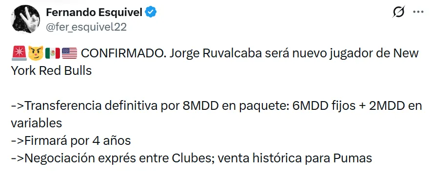 Si bien Ruvalcaba era una pieza valiosa dentro del esquema del entrenador, en Pumas entendieron que la propuesta era imposible de rechazar. La cifra que ingresará a las arcas del club es considerada histórica y permitirá fortalecer el proyecto deportivo a futuro.
