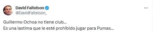 En este sentido, David Faitelson propuso que Guillermo Ochoa debería ser el nuevo portero de Pumas, a pesar de que no hay posibilidades de que se concrete esto. “Guillermo Ochoa no tiene club… Es una lastima que le esté prohibido jugar para Pumas“, escribió el periodista en su cuenta de X (ex Twitter).