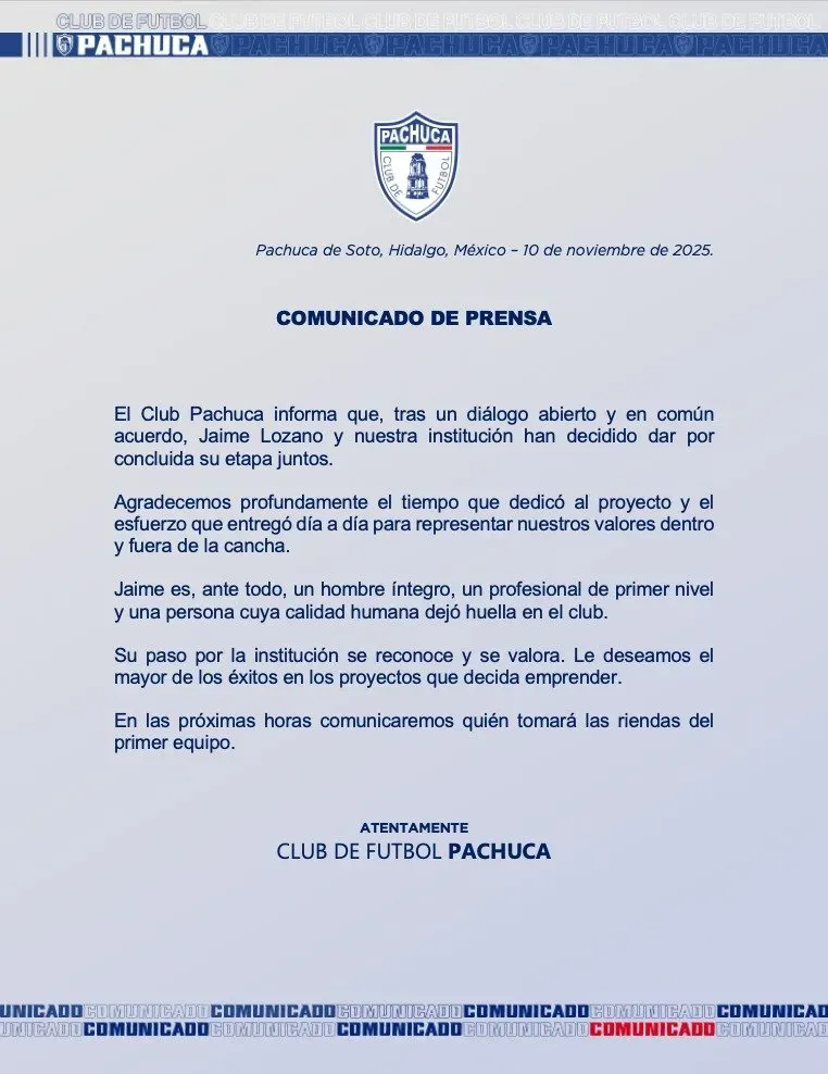 - Jaime Lozano fue destituido como técnico del Pachuca tras perder ante Santos Laguna.