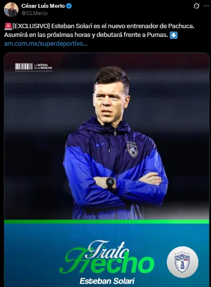 El insider confirma que el nombre del nuevo DT de Pachuca será Esteban Solari, el estratega argentino tomará las riendas de cara a su siguiente partido, con la intención de que clasifique a la Liguilla. El elegido es tomado en cuenta porque dirigió a otro de sus equipos del Grupo, es decir, Everton de Viña del Mar, que los llevó a la Copa Sudamericana antes de que se fueran a la zona de descenso en el torneo presente.