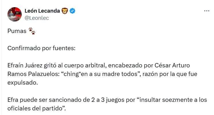 Efraín Juárez volvió a ser protagonista en el encuentro tras ser nuevamente expulsado por el árbitro. El entrenador de Pumas se enojó y dejó fuertes palabras para el cuerpo arbitral que hicieron que vea la tarjeta roja. La situación generó gran polémica y comentarios inmediatos en redes sociales, donde los aficionados reaccionaron a la fuerte reacción del DT.