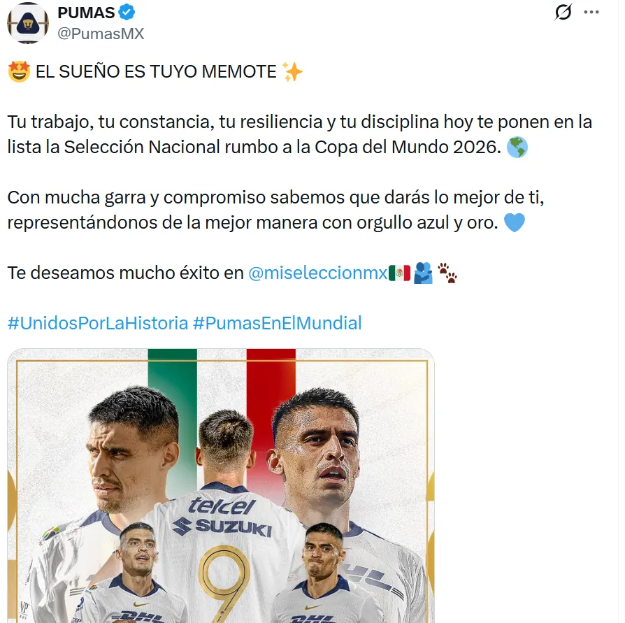“EL SUEÑO ES TUYO MEMOTE. Tu trabajo, tu constancia, tu resiliencia y tu disciplina hoy te ponen en la lista de la Selección Nacional rumbo a la Copa del Mundo 2026. Con mucha garra y compromiso sabemos que darás lo mejor de ti, representándonos de la mejor manera con orgullo azul y oro. Te deseamos mucho éxito en @miseleccionmx”, escribió el club en sus redes.
