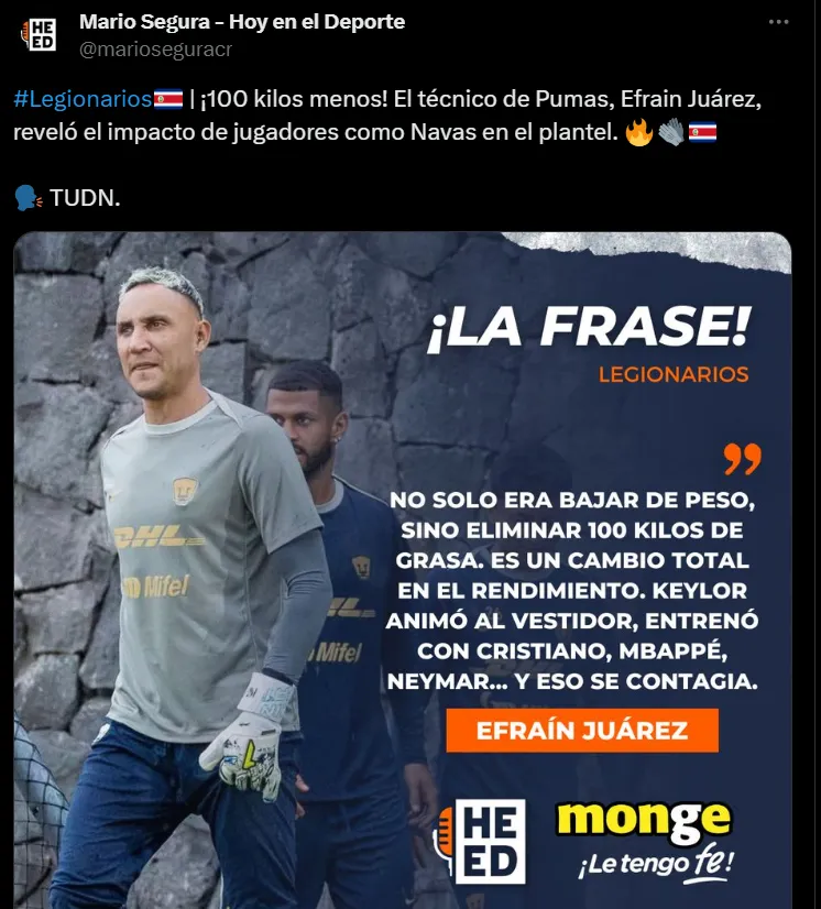 Keylor no se convirtió en fichaje de Pumas solo para mejorar desde lo futbolístico sino que también ha tenido un papel muy importante en otros aspectos desde que está en el equipo y así lo confirmó Juárez, entrenador de Pumas, que destacó al arquero.