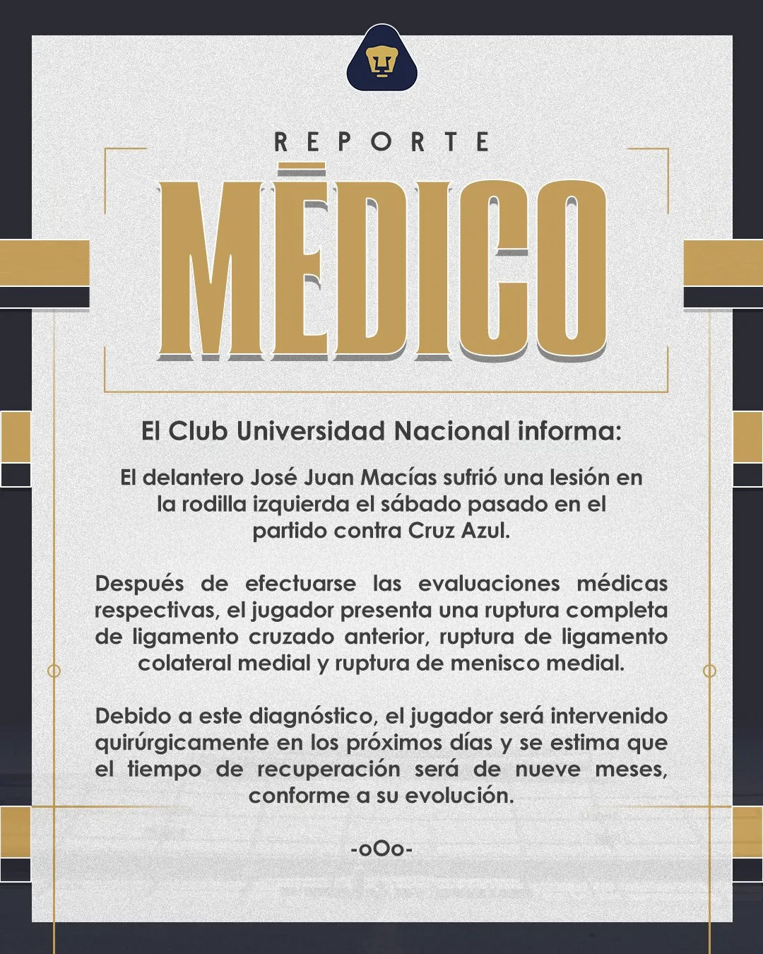 La felicidad de clasificar a los Play-In del Apertura 2025 en la última jornada y con el sueño intacto de pelear el título hasta el final, quedó opacada en Pumas UNAM tras confirmarse la peor noticia sobre José Juan Macías, delantero del equipo universitario.