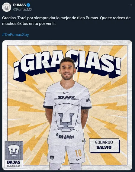 Tras la eliminación en el Clausura 2024, Pumas comenzó con su proceso de limpieza, y anunció cuatro nuevas bajas para el mercado de fichajes. Mediante las redes sociales, los Auriazules le dieron la despedida a Eduardo Salvio, Adrián Alderete, Jesús Molina y Christian Tabó.