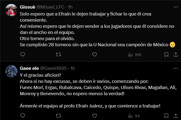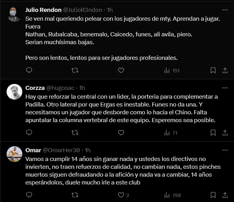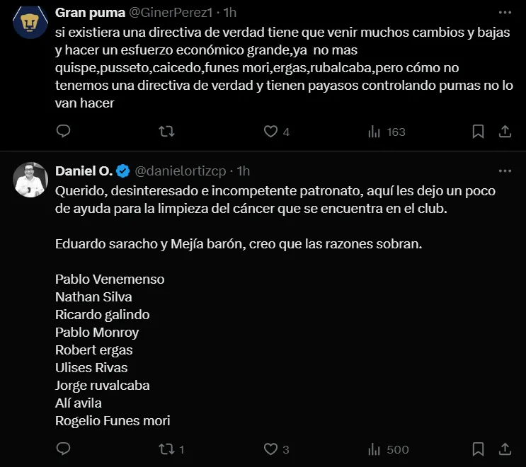 Además de los futbolistas, los altos mando de los Universitarios también fueron señalados por los seguidores del equipo. “Todos los directivos de Pumas y más de la mitad de la plantilla de jugadores se deben de ir”, fue unos de los mensajes que se vio en el posteo del club.