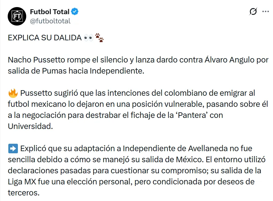 Ignacio Pussetto no tuvo el paso que imaginaba por el futbol mexicano y, tras un ciclo corto, terminó regresando a su país para sumarse a Independiente. Su salida de Pumas UNAM no fue en los mejores términos, ya que desde el club ya no contaban con él dentro del proyecto deportivo.