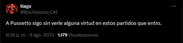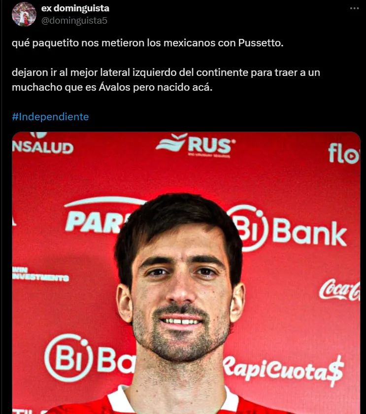 Sin embargo, la situación en Argentina tampoco es favorable para el delantero. En Independiente ha tenido pocos minutos y cuando le tocó jugar no logró convencer, lo que despertó críticas de la afición. “Qué paquetito nos metieron los mexicanos con Pussetto”, expresó un aficionado. Otro agregó: “Dejaron ir al mejor lateral izquierdo del continente para traer a un muchacho que es Ávalos, pero nacido acá. Ávalos tiene que ser titular en Chile. Se lo ganó. Avalos no puede jugar nunca más en Independiente y avísenle a Pussetto que ya no está más en México”. Además, se leyó: “A Pussetto sigo sin verle alguna virtud en estos partidos que entró”.