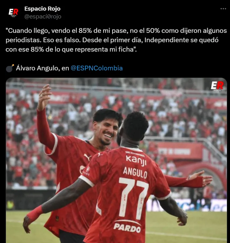 Ángulo también aclaró cómo fue su transferencia y desmintió algunas versiones que circularon en medios argentinos: “Cuando llego, vendo el 85% de mi pase, no el 50% como dijeron algunos periodistas. Eso es falso. Desde el primer día, Independiente se quedó con ese 85% de lo que representa mi ficha.”