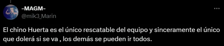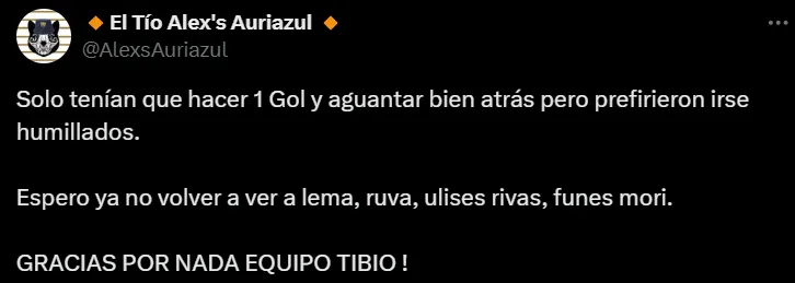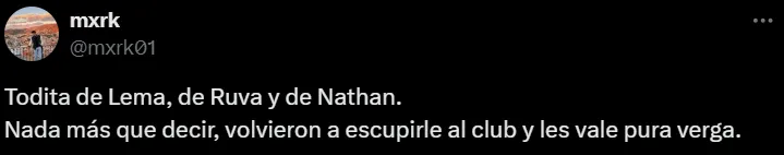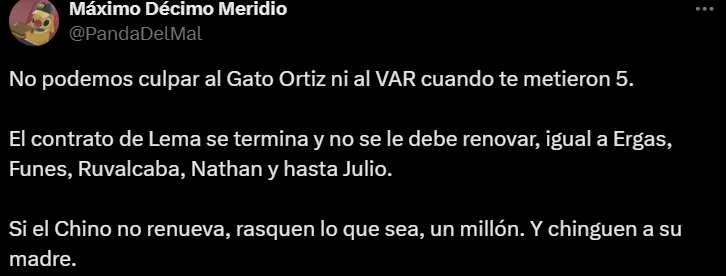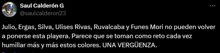 “Espero ya no volver a ver a Lema, Ruvalcaba, Ulises Rivas y Funes Mori. ¡Gracias por nada equipo tibio!”, escribió un usuario en X (ex Twitter). En tanto, otros, en esa misma línea, agregaron: “El contrato de Lema se termina y no le deben renovar, igual que a Ergas, Funes Mori, Ruvalcaba Nathan Silva y hasta Julio (González)”, “todita de Lema, Ruvalcaba y Nathan” y “Julio, Ergas, Silva, Ulises Rivas, Ruvalcaba y Funes Mori no pueden volver a ponerse esta playera”.