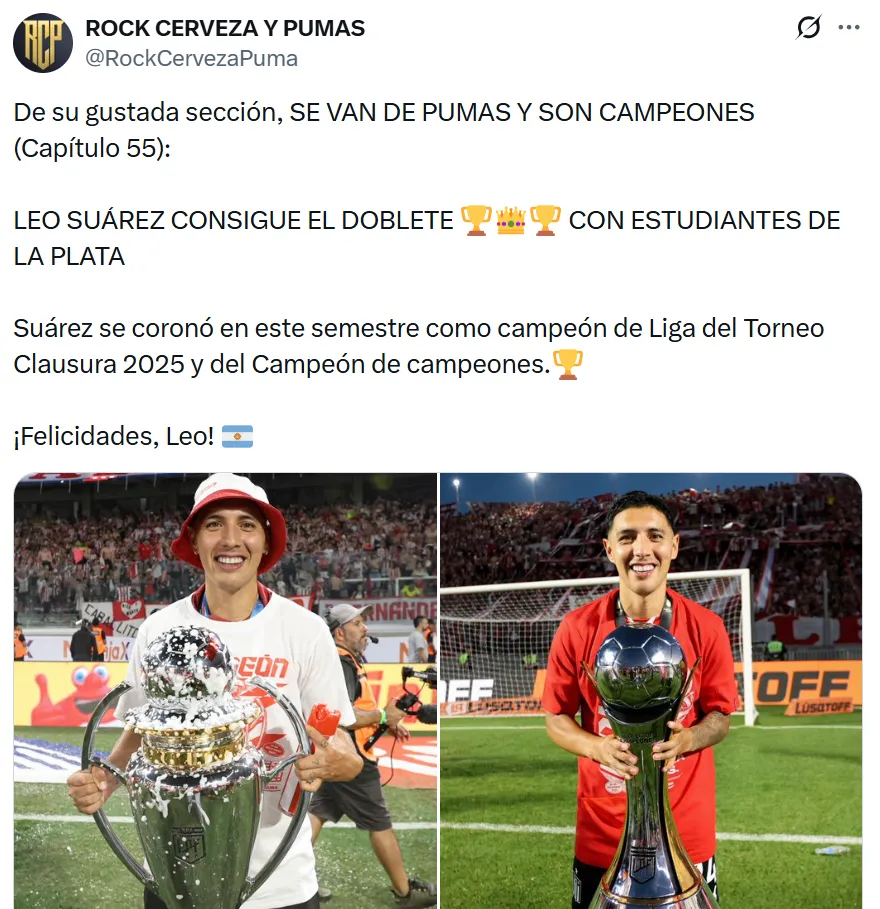 Leo Suárez viene de jugar a préstamo en Argentina para Estudiantes de La Plata, donde no tuvo muchos minutos debido a lesiones que también lo complicaron durante su paso por Pumas. Si bien ganó dos títulos, no fue protagonista y ahora deberá volver al equipo universitario, que sigue siendo dueño de su pase, pero que no contará con él para la próxima temporada.