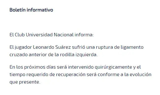 Y ese mal augurio se confirmó en las primeras horas del martes, cuando se confirmó que Suárez sufrió la rotura de ligamento anterior cruzado de su rodilla izquierda, una de las peores sino la peor lesión que puede tener un futbolista profesional, según informó el parte oficial de Pumas.