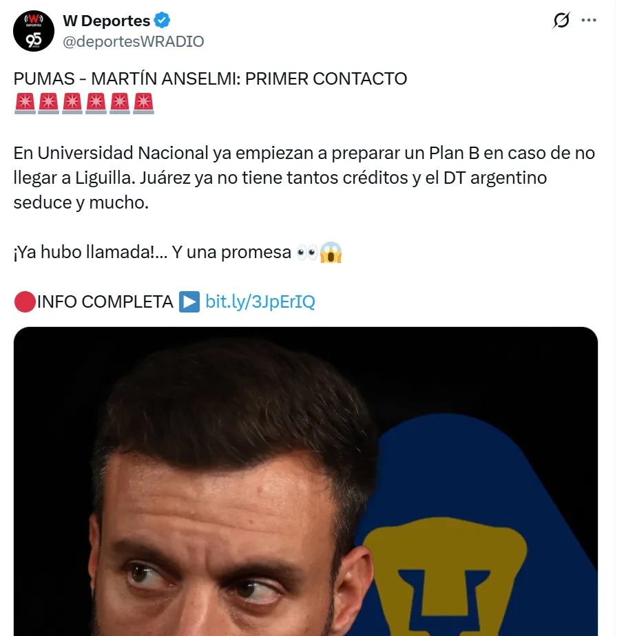 Según lo que informaron en W Deportes, ya hubo un primer contacto entre la directiva de Pumas y Anselmi. La misma fue muy positiva pero el DT no quiere intervenir en el trabajo de Efraín Juárez, por lo que volverían a hablar una vez que termine la temporada y se defina el futuro del equipo como también del entrenador mexicano.