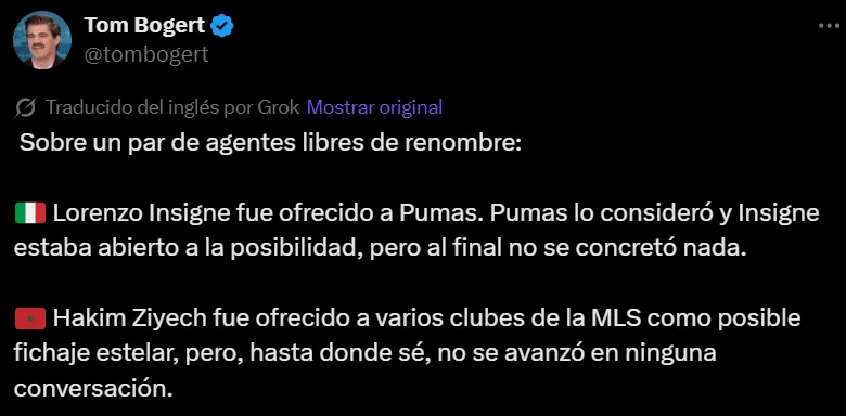 Así lo confirmó el periodista Tom Bogert. “Lorenzo Insigne fue ofrecido a Pumas. Pumas lo consideró y Insigne estaba abierto a la posibilidad, pero al final no se concretó nada”, publicó este martes el citado comunicador especializado en la MLS. Finalmente, a pesar de que los contactos fueron reales, los Felinos no pudieron cerrar un fichaje que hubiese resonado.