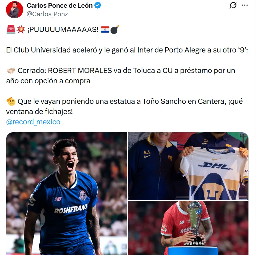 Recientemente, Pumas aceleró y también cerró la llegada de Robert Morales. El delantero, proveniente de Toluca, se incorpora al plantel a préstamo por un año con opción a compra, reforzando aún más la ofensiva para Juárez de cara al Clausura 2026.