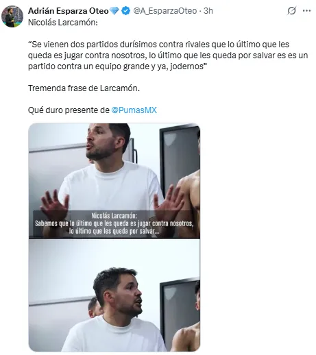 Pero en su discurso, prácticamente les dejó claro que Pumas ya no peleaba nada, la burla que le hizo Larcamón fue minimizar a la escuadra auriazul. Para el técnico tanto Puebla como los universitarios lo único que tienen ambos conjuntos es el juego ante ellos, puesto que prácticamente han quedado fuera de la competencia en Liguilla.