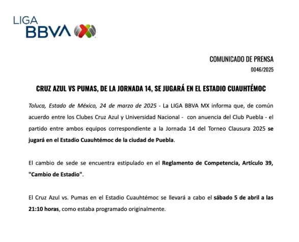 “El cambio de sede se encuentra estipulado en el Reglamento de Competencia, Artículo 39, ‘Cambio de Estadio'”, concluyó la Liga MX en su comunicado oficial publicado este lunes 24 de marzo.