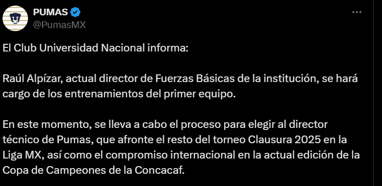 El club confirmó que, mientras se elige al nuevo técnico, Raúl Alpízar, actual director de Fuerzas Básicas de Pumas, será quien se haga cargo de los entrenamientos del primer equipo que busca salir de la crisis futbolística que está pasando.
