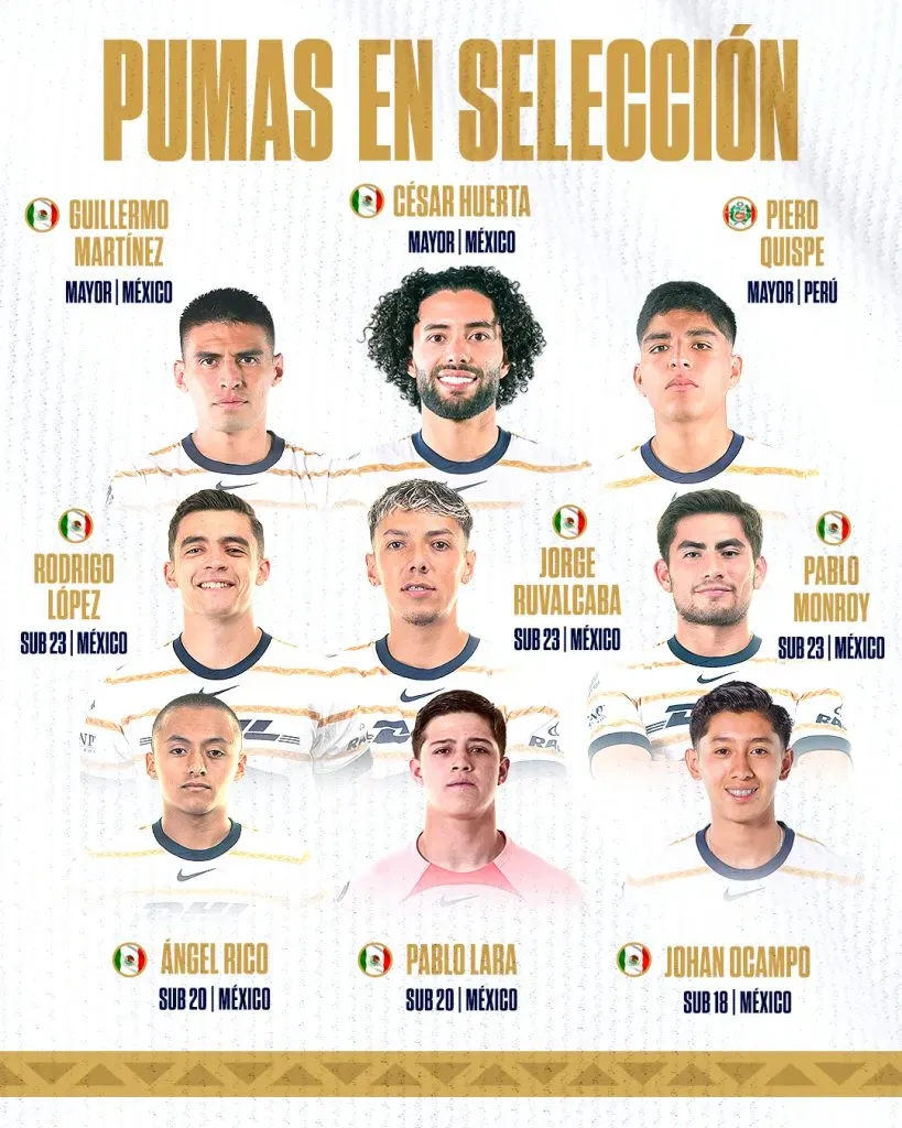 Pumas transmitió el orgullo que significa ser convocado a través de una publicación en su cuenta de ‘X’, ex Twitter. Guillermo Martinez y César Huerta fueron convocados a la Mayor de la Selección Mexicana, mientras que Piero Quispe en la misma categoría pero en Perú.