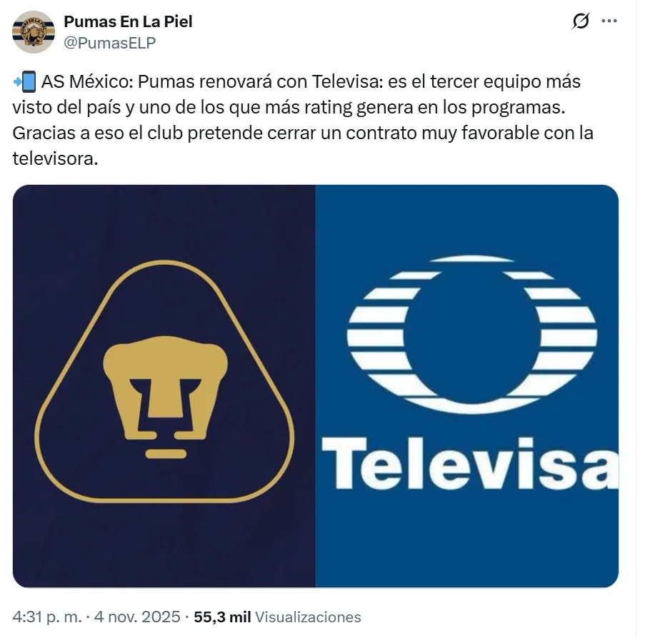 - Pumas UNAM renovará su contrato de transmisión con Televisa para el 2026 en condiciones muy favorables.